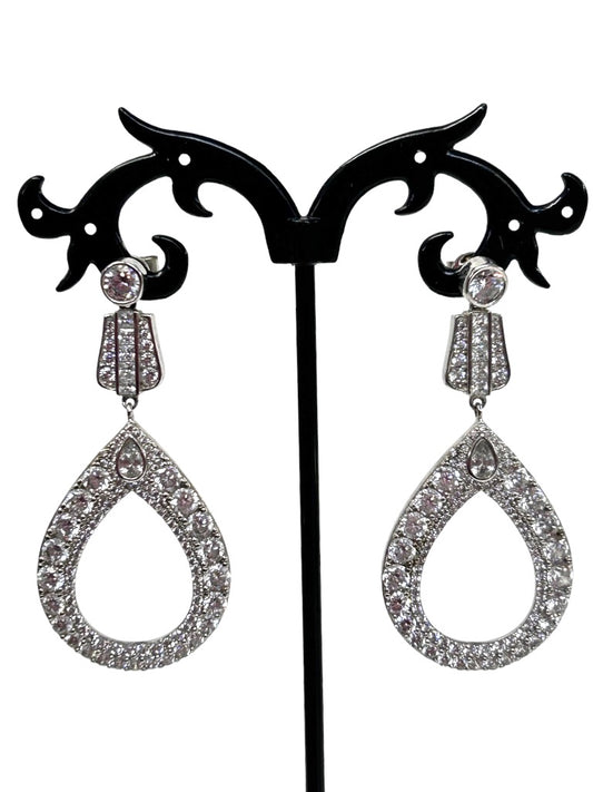Rhinestone Teardop Earrings Silvertone 2" Drop Dangle Post Pierced Earrings