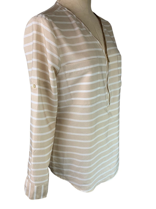 Small Calvin Klein Tan White Stripe 1/2 Zip Slightly Sheer Women's Blouse