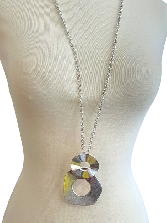 JV Silver Tone Long Necklace Link Chain With Large Silver Double Circle Pendant 36" + 3"
