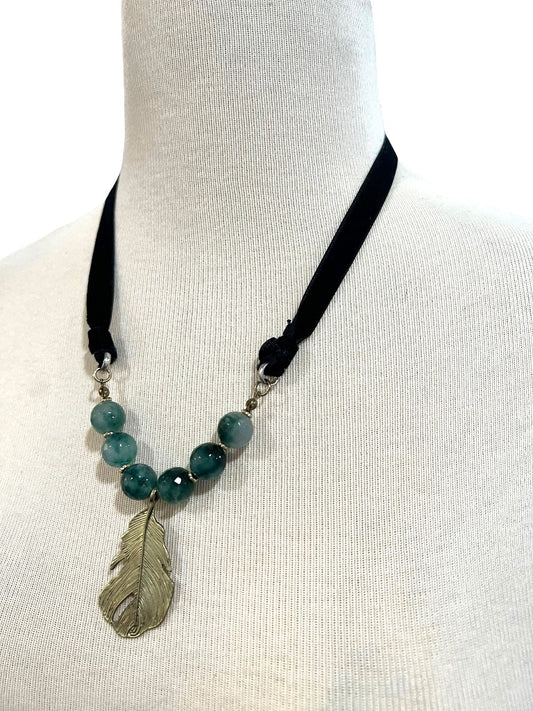 Blue Fluorite Stone Goldtone Leaf Necklace Velvet Tie Adjustable 36"