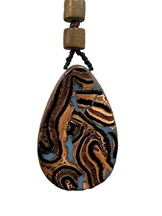 Boho Wooden Beaded Lariat Necklace Teardrop Pendant 23.5"