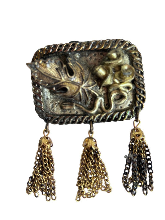 Antiqued Goldtone Rectangle Brooch Leaf and Flower Tassels 2"w x 2.75"l