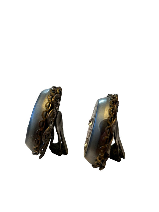 Vintage Clip On Earrings Non-Pierced Silver Plastic Ornate Metal Back and Edging 1.25"
