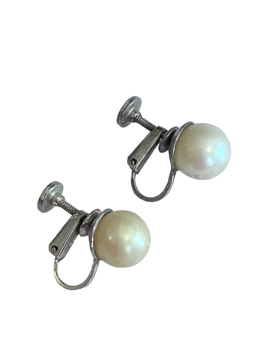 Vintage 1960s Faux Pearl Screwback Non-Pierced Earrings 3/8" Silvertone