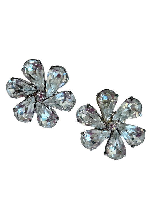 Vintage Screwback Non-Pierced Earrings Clear Crystal Flower 1 1/8" Diameter