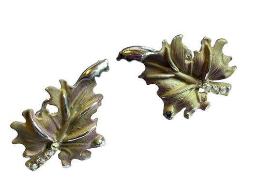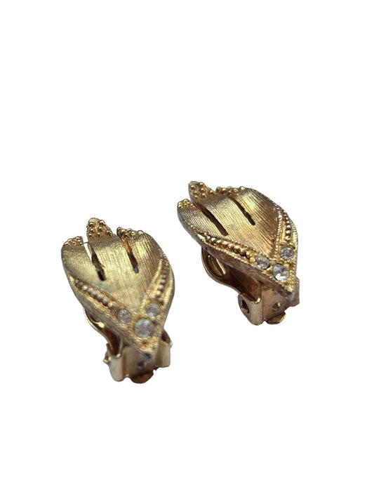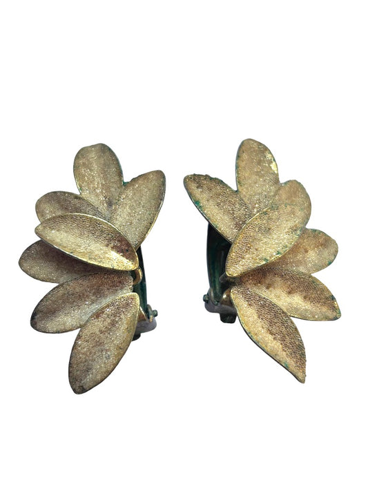 Vintage Clip On Non-Pierced Earrings Goldtone Brushed Textured Leaf 1.5"