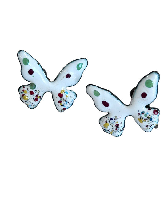 Vintage Enameled Butterfly Screwback Earrings Non-Pierced White Multicolor 1"