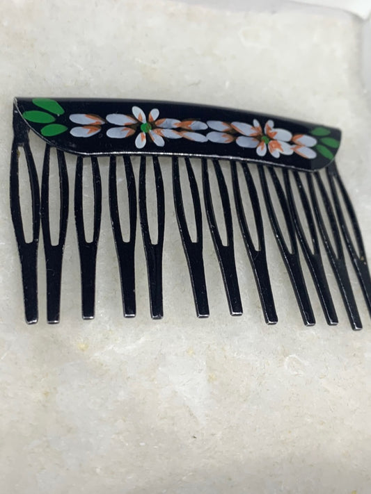 Vintage Black Metal Hair Comb Toleware Style 3.25"l x 1.5"h Painted Floral