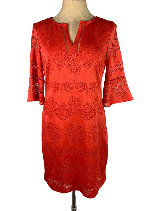 6 Dressbarn Bright Coral Stretch Lace Sheath Dress Bell Sleeve Back Zip