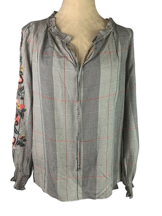 XS Curations Women's Plaid Peasant Blouse Embroidered Beaded Sleeve Pullover