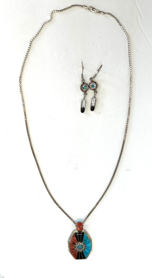 Native American Sterling Silver And Stone Inlay Pendant Necklace and Dangle Earrings