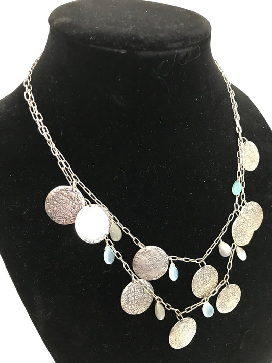 Tiered Silvertone Coin Medallion 20" Necklace Blue Beads Hook Closure