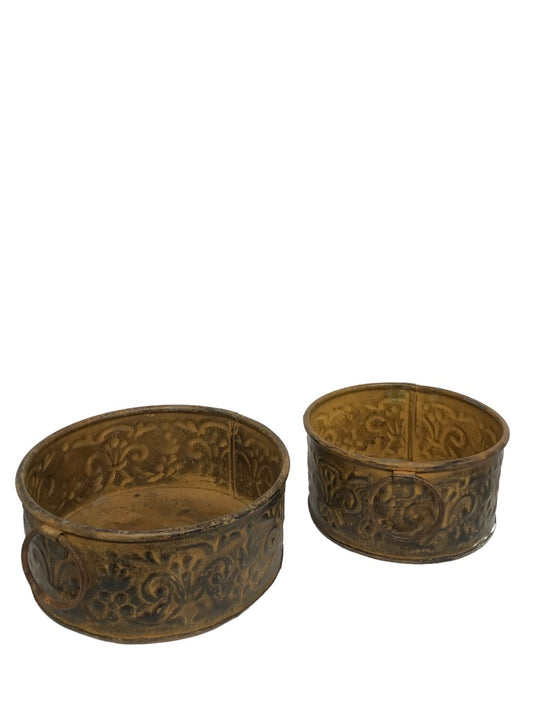 Set of 2 Round Metal Planters Embossed Design 5" and 6" Diameter