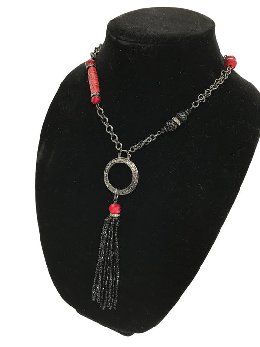 Black Beaded 35" Strand Necklace Red Accents Tassel 6.5" Dramatic