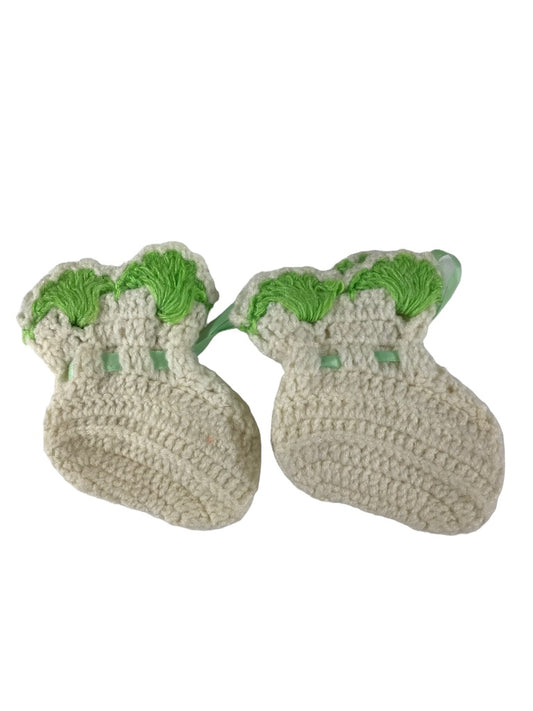Vintage Crocheted Baby Booties White Green Trim Ribbon