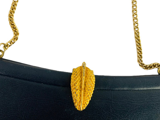 Navy Blue Faux Leather Handbag Goldtone Leaf Clasp Hinged Clutch