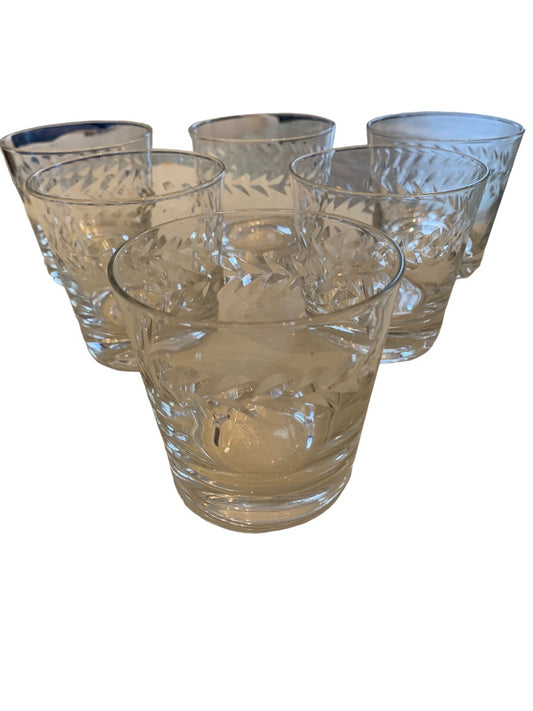 Set of 6 Vintage Glass Tumblers 7 oz Etched Design 3 1/4"h x 3 1/4"d