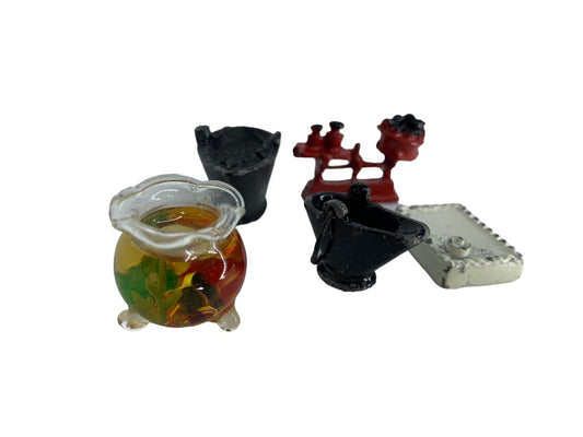 Dollhouse Miniature Assorted Lot Glass Kettle Cast Iron Coal Bucket Scale Lot of 5