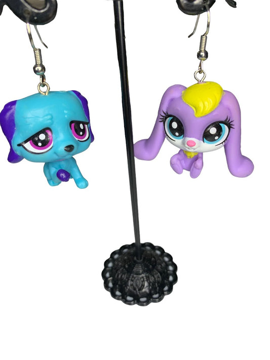 Littlest Pet Shop Earrings Drop Dangle 2" Purple Blue Rabbit Dog Hook Pierced