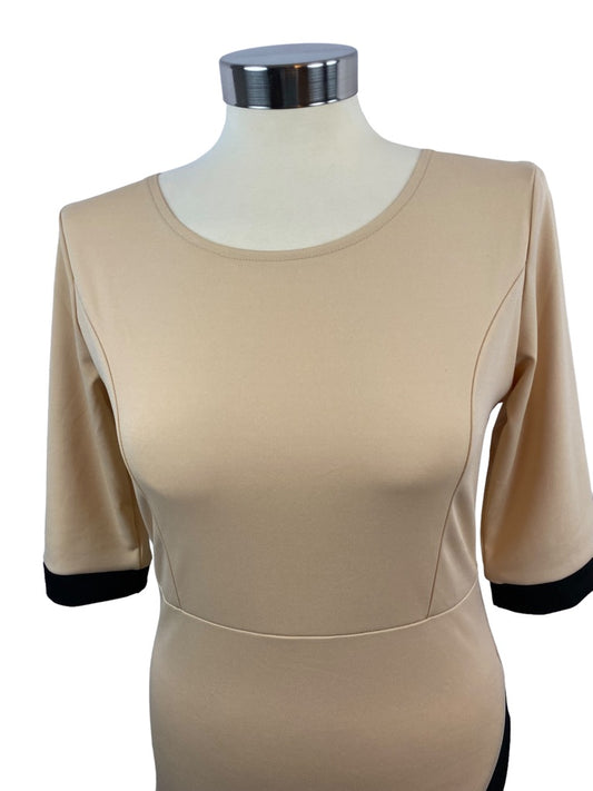 Medium Lupsona Stretch Sheath Dress 1/2 Sleeve Tan Black Trim