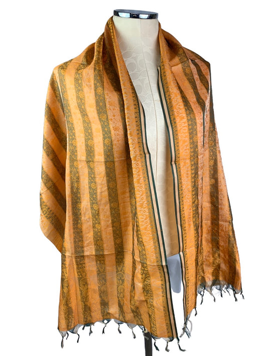 Orange Brown Stripe Fringed Shawl Scarf Lightweight 21" x 67" Floral