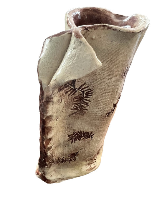 Handmade Natural Glazed Imprint Floral Pinch Vase Signed