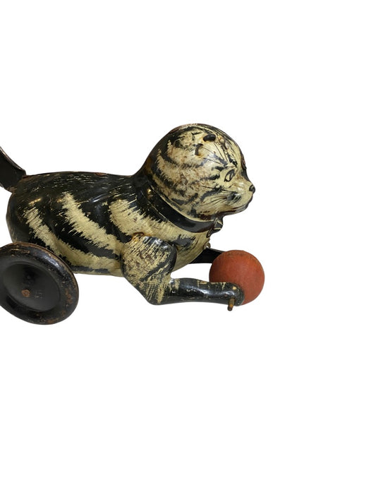 1930s Marx Tin Toy Friction Lever Cat with Wooden Ball 8" Length