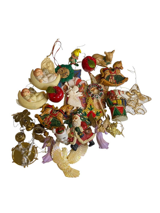 Lot of 25 Assorted Hanging Holiday Ornaments Bells Apple Drum Angel