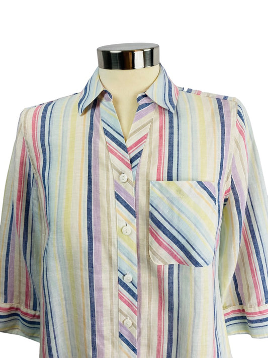 0/2 Petite Chico's Women's Striped Linen Button Up 3/4 Sleeve Shirt Blouse No-Iron