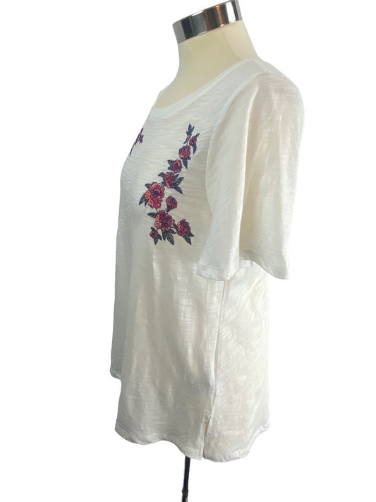 XS DG2 Diane Gilman White Round Neck Women's Tshirt Red Pink Rose Embroidered