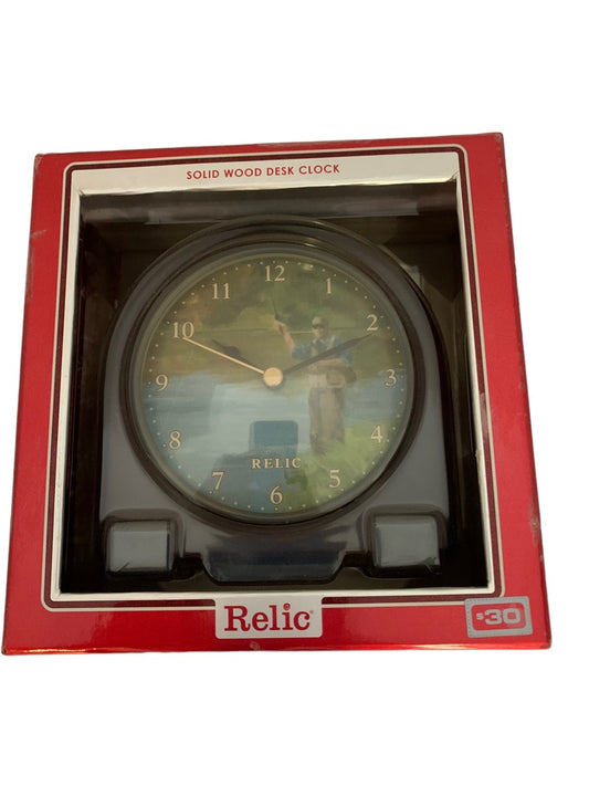 Relic Solid Wood Desk Clock New Fly Fishing Theme 5"h x 4.5"w New