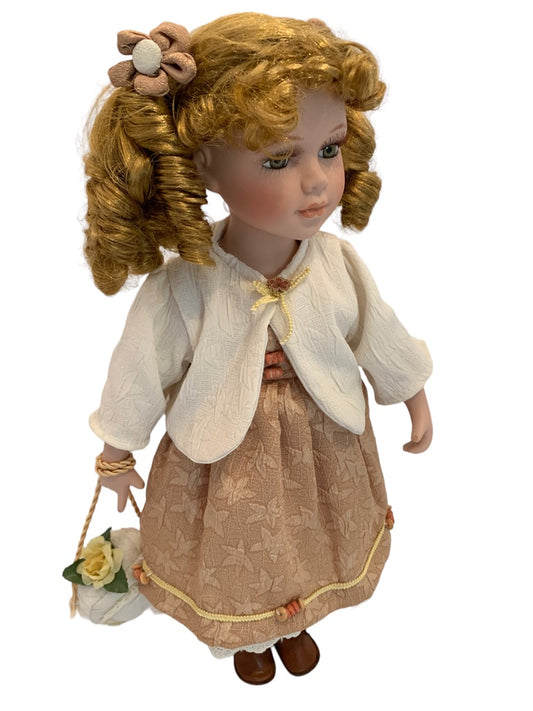 Vintage Porcelain Doll Victorian Girl Dress Style 16.5" h with Stand Strawberry Blonde Curls
