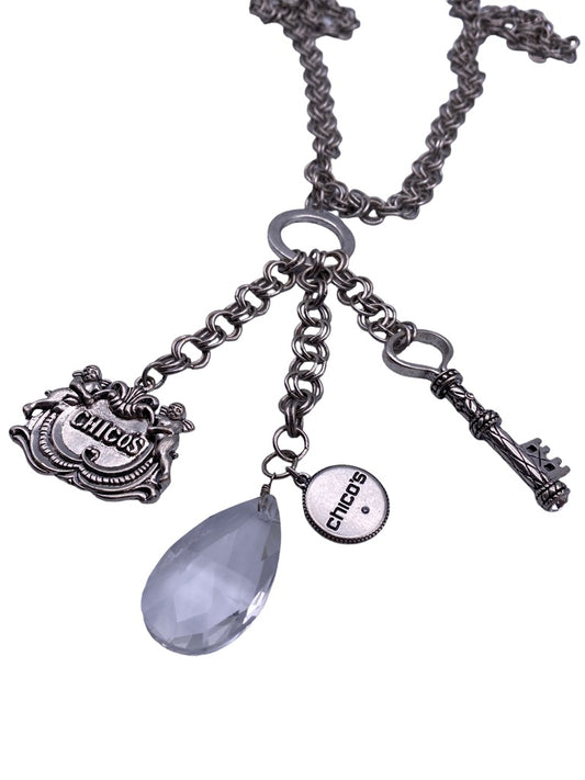 Chico's Silvertone Chunky Chain 34" Pendant Necklace Toggle Clasp Key Crystal Crest
