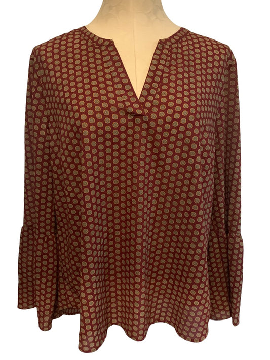 XL J.Crew Burgundy Print Pullover Bell Sleeve Blouse Style H1074
