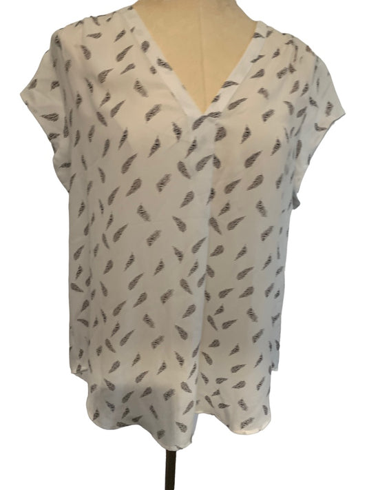 XL fun2fun Women's Off White Feather Print Sheer Split Neck Short Sleeve Pullover Blouse