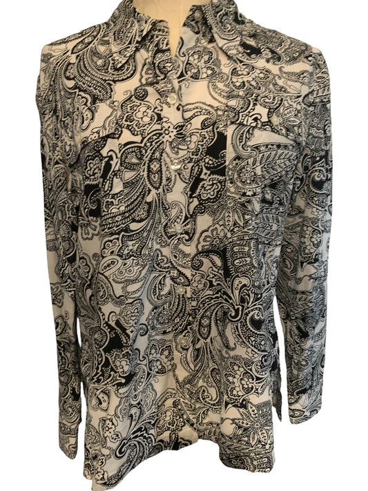 Large Jones New York Signature Black Off White Paisley Print Women's Button Up