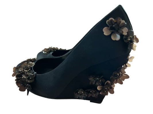 7.5 M Tory Burch Pixie Black Satin Wedge Heels 3D Flowers Formal Evening