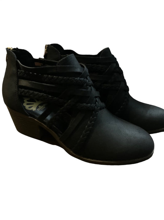 6M Fergalicious Black Bunker Bootie 2" Block Heel Braided Detail Goldtone Zipper