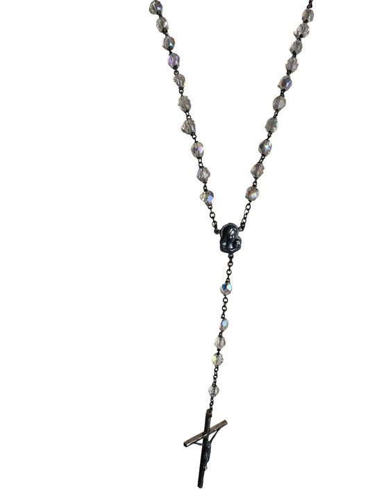 Vintage Aurora Borealis Beaded Rosary Silvertone Crucifix 28" + 7" Drop Necklace