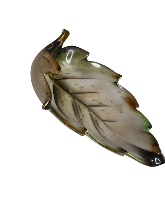 Midcentury Ceramic Leaf Trinket Dish Green Brown Gold Trim 6" x 4"