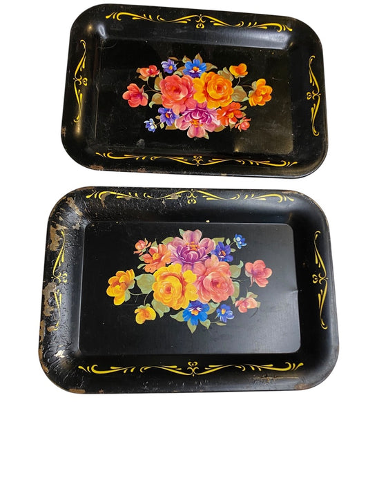 Set of 2 Vintage Toleware Small Metal Bar Trays 6.75" x 4.75" Floral Black