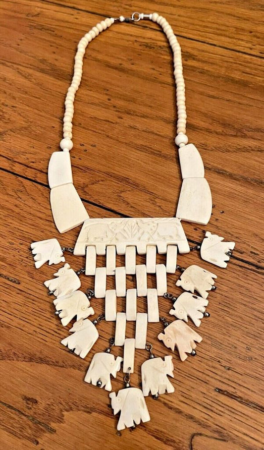 Vintage Bone Necklace 21" Statement Bib Elephant Design 5" Drop