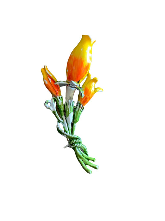 Vintage Yellow Orange Tulip Bouquet Brooch Enamaled Paint 1.5"
