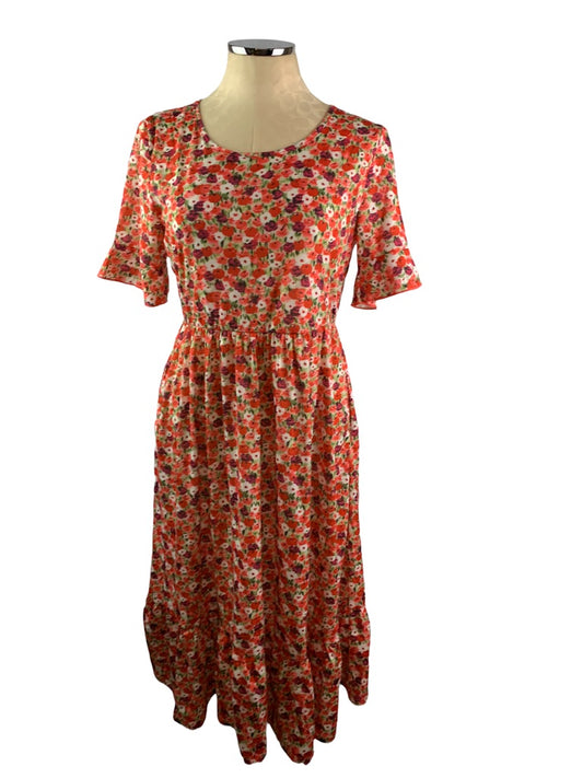 Medium Women's Floral Coral Print Tshirt Dress Midi Length Ruffle Hem