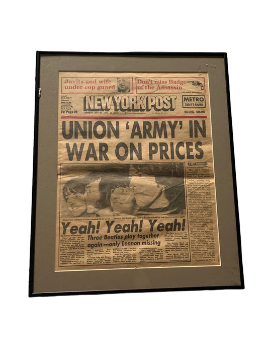 Framed NY Post Cover Monday, May 12th 1979 Three Beatles Play Together 17.5" x 14.5"