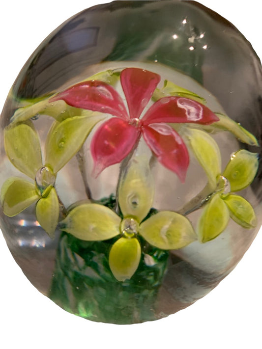 Egg Shaped Glass Paperweight Yellow Red Flowers in Grass 3.4"h x 3"d