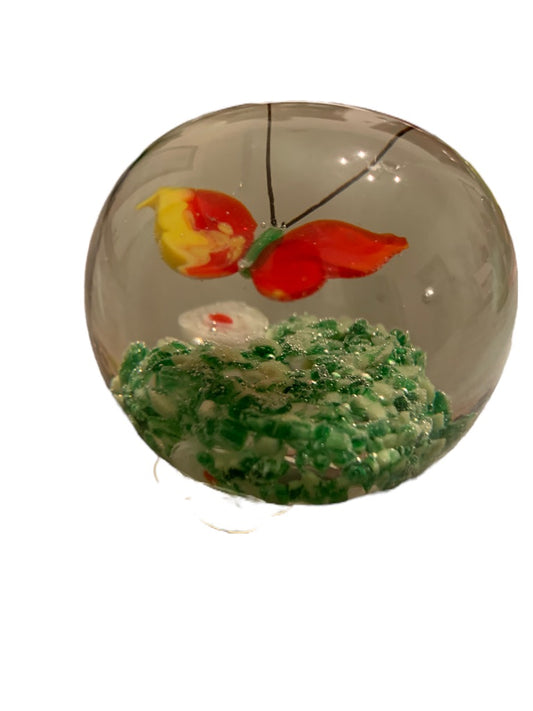 Glass Globe Paperweight Red Yellow Butterfly Grass 1.8"h x 2"d