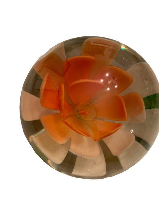 Small Glass Orange Flower Paperweight 2"d x 1.8"h