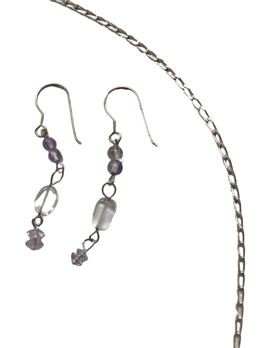 Set Delicate Silvertone 18" Necklace and 1.5" Drop Hook Earrings Orchid Beads