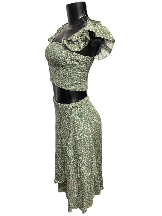 Small Hashtag 2 Piece Outfit Half Wrap Skirt & Smocked Crop Shirt Green